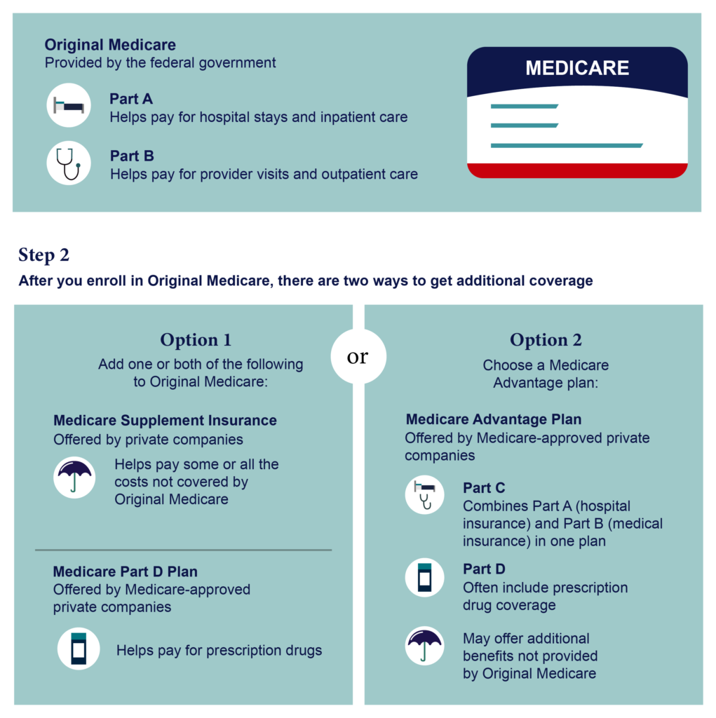 Original Medicare has two Parts: Part A helps pay for hospital stays and inpatient care, while Part B helps pay for doctor visits and outpatient care.